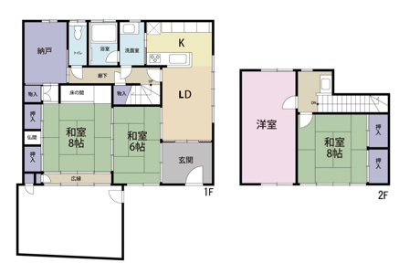 4LDK+1S(納戸) 1F/和室 8.0帖 1室 1F/和室 6.0帖 1室 1F/S 1室 1F/LD 1室 1F/K 1室 2F/洋室 1室 2F/和室 8.0帖 1室 |