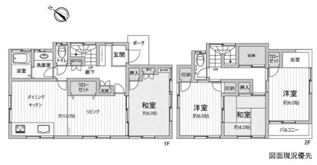 4LDK 1F/LDK 12.0帖 1室 1F/和室 6.0帖 1室 2F/洋室 6.0帖 2室 2F/和室 4.5帖 1室 |