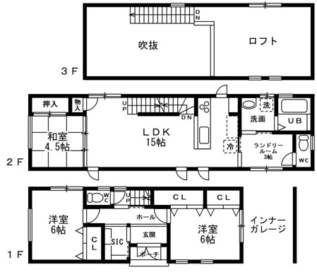 3LDK 1F/洋室 6.0帖 2室 2F/LDK 15.0帖 1室 2F/和室 4.5帖 1室 3F/その他 11.5帖 1室 |