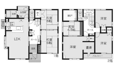 6LDK+1S(納戸) 1F/LDK 1室 1F/和室 6.0帖 2室 2F/洋室 3室 2F/和室 4.5帖 1室 2F/S 1室 |