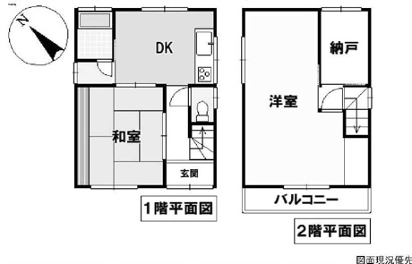 2DK+1S(納戸) 1F/DK 1室 1F/和室 1室 2F/洋室 1室 2F/S 1室 |