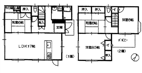 4LDK 1F/LDK 17.0帖 1F/和室 6.0帖 2F/洋室 8.5帖 2F/洋室 6.0帖 2F/和室 6.0帖 |