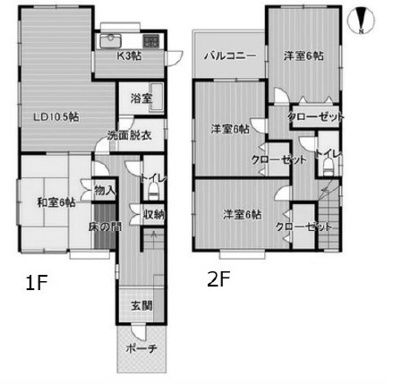 4LDK 1F/LD 10.5帖 1室 1F/K 3.0帖 1室 1F/和室 6.0帖 1室 2F/洋室 6.0帖 3室 |