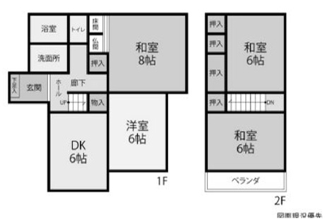 4DK 1F/DK 6.0帖 1室 1F/和室 8.0帖 1室 1F/洋室 6.0帖 1室 2F/和室 6.0帖 2室 |