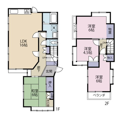4LDK 1F/LDK 16.0帖 1室 1F/和室 6.0帖 1室 2F/洋室 6.0帖 2室 2F/洋室 4.5帖 1室 |