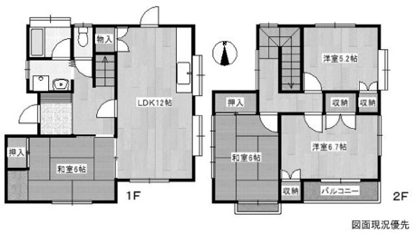 4LDK 1F/LDK 12.0帖 1室 1F/和室 6.0帖 1室 2F/洋室 6.7帖 1室 2F/和室 6.0帖 1室 2F/洋室 5.2帖 1室 |