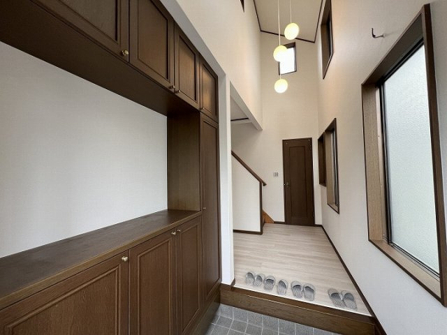1階には8帖の和室があり、主寝室としても利用可能。玄関の吹抜けが明るさと開放感を演出します。宅地が道路より一段高く、プライバシーに配慮された安心設計です。