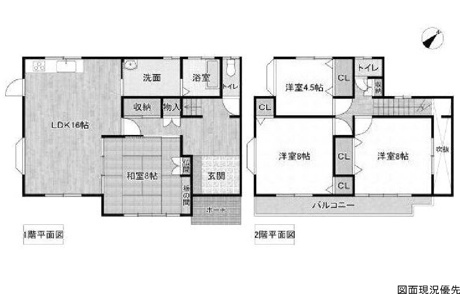 4LDK 1F/LDK 16.0帖 1室 1F/和室 8.0帖 1室 2F/洋室 8.0帖 2室 2F/洋室 4.5帖 1室 |