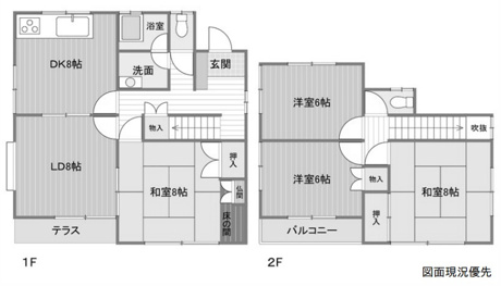 4LDK 1F/LDK 1室 1F/和室 8.0帖 1室 1F/和室 8.0帖 1室 2F/洋室 6.0帖 2室 |