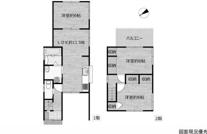 3DK 1F/LDK 11.5帖 1室 1F/洋室 6.0帖 1室 2F/洋室 6.0帖 2室 |