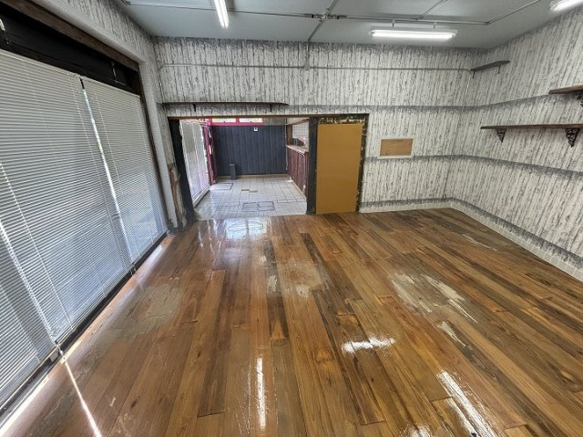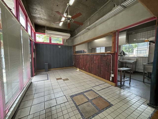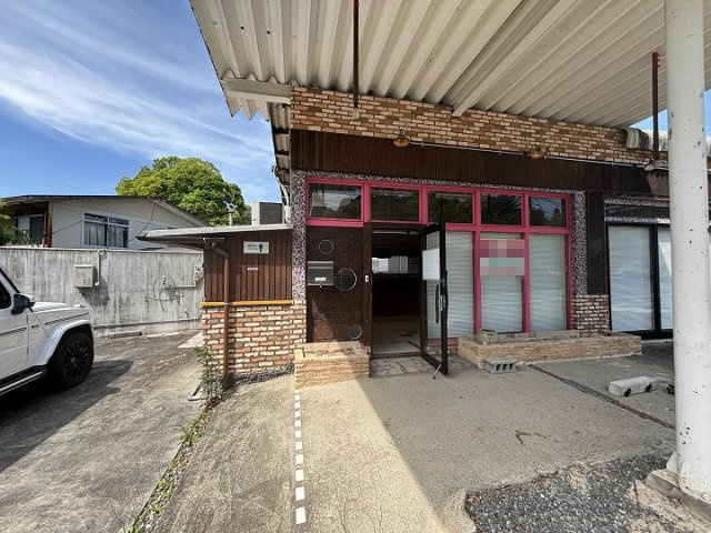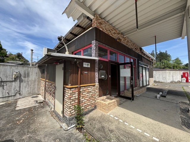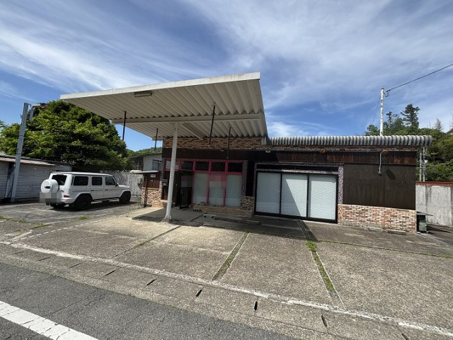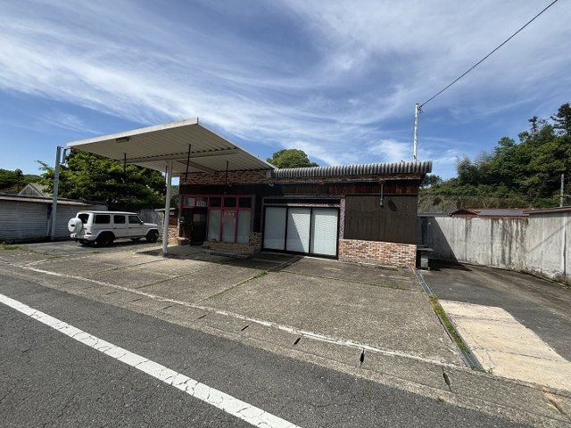 岩国美和線沿いの空きテナント物件。コンクリートブロック造ストレートぶき平屋建。附属倉庫あり(コンクリートブロック造・陸屋根平屋建、22.64㎡、昭和56年築※月日不詳)未登記のガレージ(5台分)あり。