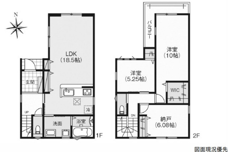 2LDK+1S(納戸) 1F/LDK 18.5帖 1室 2F/洋室 10.0帖 1室 2F/洋室 5.2帖 1室 2F/S 6.0帖 1室 |