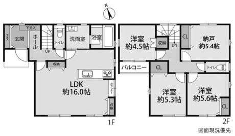 3LDK+1S(納戸) 1F/LDK 16.0帖 1室 2F/洋室 5.6帖 1室 2F/洋室 5.3帖 1室 2F/洋室 4.5帖 1室 2F/S 5.4帖 1室 |