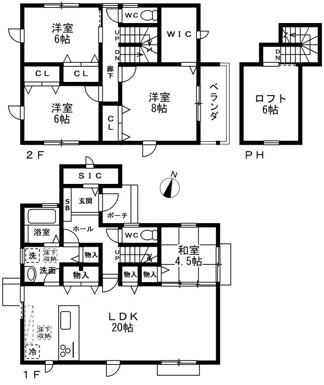 4LDK 1F/LDK 20.0帖 1室 1F/和室 4.5帖 1室 2F/洋室 8.0帖 1室 2F/洋室 6.0帖 2室 |