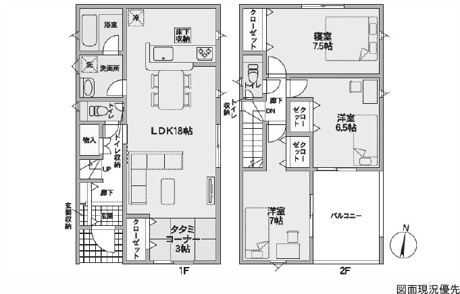 3LDK 1F/LDK 18.0帖 1室 2F/洋室 7.5帖 1室 2F/洋室 7.0帖 1室 2F/洋室 6.5帖 1室 |