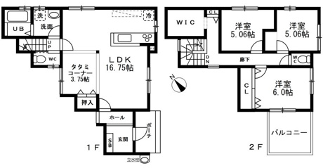 4LDK+1S(納戸) 1F/LDK 16.7帖 1室 1F/和室 3.7帖 1室 2F/洋室 6.0帖 1室 2F/洋室 5.0帖 2室 2F/S 1室 |