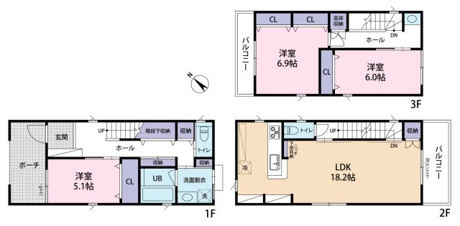 3LDK 1F/洋室 5.1帖 1室 2F/LDK 18.2帖 1室 3F/洋室 6.9帖 1室 3F/洋室 6.0帖 1室 |