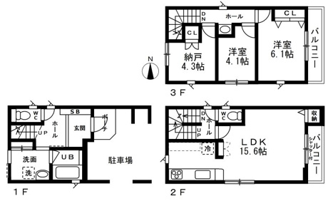 2LDK+1S(納戸) 2F/LDK 15.6帖 1室 3F/洋室 6.1帖 1室 3F/洋室 4.1帖 1室 3F/S 4.3帖 1室 |