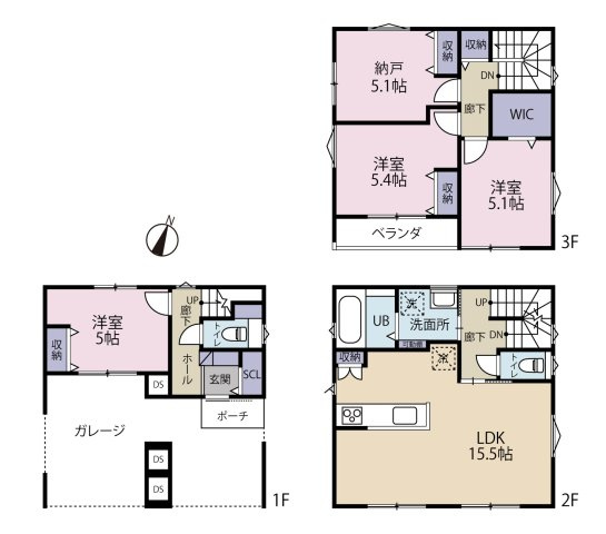3LDK+1S(納戸) 1F/洋室 5.0帖 1室 2F/LDK 15.5帖 1室 3F/洋室 5.4帖 1室 3F/洋室 5.1帖 1室 3F/S 5.1帖 1室 |