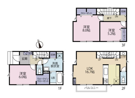 3LDK 1F/洋室 6.0帖 1室 2F/LDK 16.7帖 1室 3F/洋室 8.0帖 1室 3F/洋室 5.2帖 1室 |