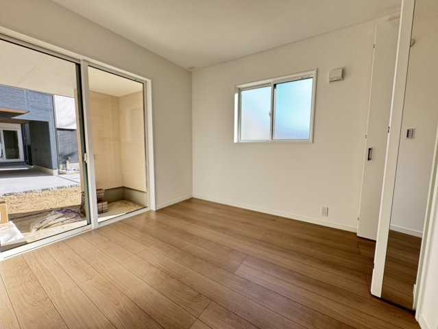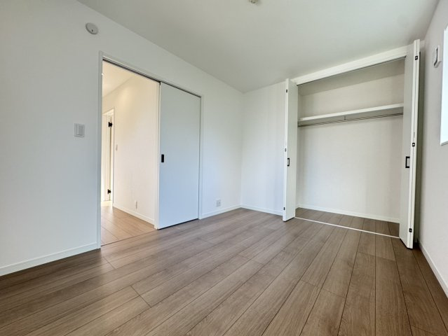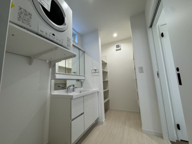 玄関前には広い駐輪場スペースがり自転車やバイクが5台前後は駐輪できそうですね♪3帖分の洗面所には着替えなどが整頓できる棚も付いていますよ!