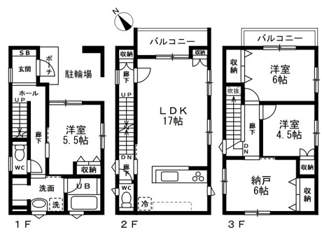 3LDK+1S(納戸) 1F/洋室 5.5帖 1室 2F/LDK 17.0帖 1室 3F/洋室 6.0帖 1室 3F/洋室 4.5帖 1室 3F/S 6.0帖 1室 |