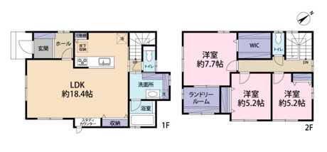 3LDK 1F/LDK 18.4帖 1室 1F/洋室 7.7帖 1室 2F/洋室 5.2帖 2室 |