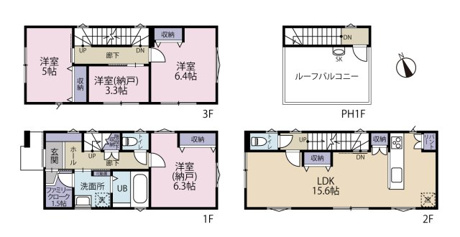2LDK+2S(納戸) 1F/S 6.3帖 1室 2F/LDK 15.6帖 1室 3F/洋室 6.4帖 1室 3F/洋室 5.0帖 1室 3F/S 3.3帖 1室 |