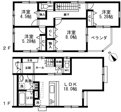 4LDK 1F/LDK 18.0帖 1室 2F/洋室 8.0帖 1室 2F/洋室 5.2帖 2室 2F/洋室 4.5帖 1室 |