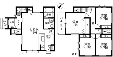 4LDK 1F/LDK 18.0帖 1室 2F/洋室 7.0帖 1室 2F/洋室 5.3帖 3室 |
