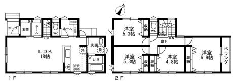 4LDK 1F/LDK 18.0帖 1室 2F/洋室 6.9帖 1室 2F/洋室 5.3帖 2室 2F/洋室 4.8帖 1室 |