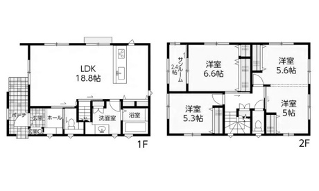 4LDK 1F/LDK 18.8帖 1室 2F/洋室 6.6帖 1室 2F/洋室 5.6帖 1室 2F/洋室 5.3帖 1室 2F/洋室 5.0帖 1室 |