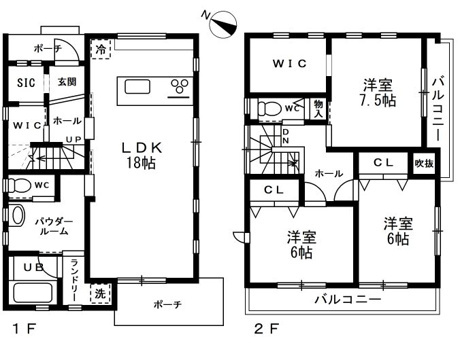 3LDK 1F/LDK 18.0帖 1室 2F/洋室 7.5帖 1室 2F/洋室 6.0帖 2室 |
