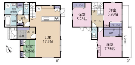4LDK 1F/LDK 17.5帖 1室 1F/和室 3.2帖 1室 2F/洋室 7.7帖 1室 2F/洋室 5.2帖 2室 |