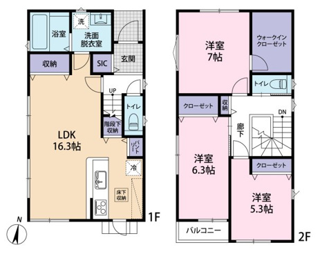 3LDK 1F/LDK 16.3帖 1室 2F/洋室 7.0帖 1室 2F/洋室 6.3帖 1室 2F/洋室 5.3帖 1室 |