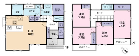4LDK 1F/LDK 18.0帖 1室 2F/洋室 7.5帖 1室 2F/洋室 5.5帖 1室 2F/洋室 5.3帖 2室 |