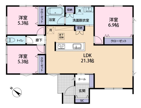 3LDK 1F/LDK 21.3帖 1室 1F/洋室 6.9帖 1室 1F/洋室 5.3帖 2室 |