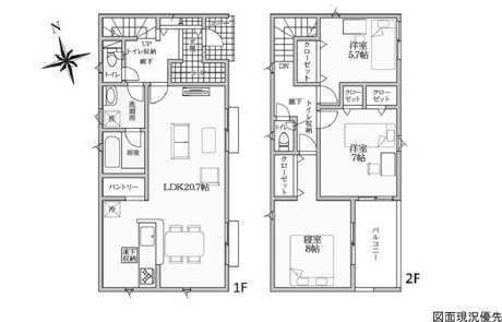 3LDK 1F/LDK 20.7帖 1室 2F/洋室 8.0帖 1室 2F/洋室 7.0帖 1室 2F/洋室 5.7帖 1室 |