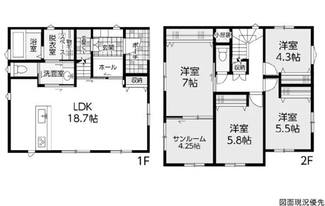 4LDK 1F/LDK 18.7帖 1室 2F/洋室 7.0帖 1室 2F/洋室 5.8帖 1室 2F/洋室 5.5帖 1室 2F/洋室 4.3帖 1室 |