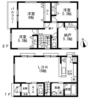3LDK+1S(納戸) 1F/LDK 19.0帖 1室 2F/洋室 8.0帖 1室 2F/洋室 5.3帖 2室 2F/S 5.3帖 1室 |