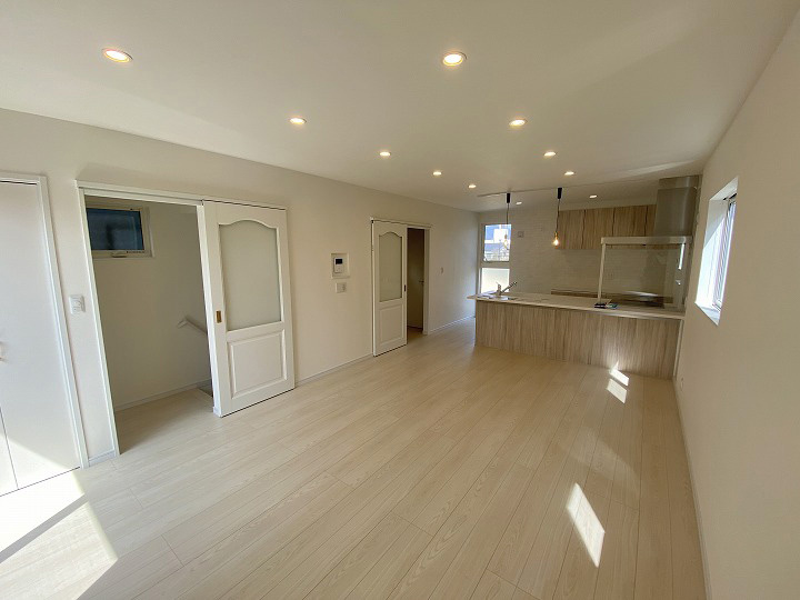 LDKには調光機能付きのLED埋込照明を採用し、流し元にはフィラメントLED電球を設置。『都会的でかわいい』空間を演出します。