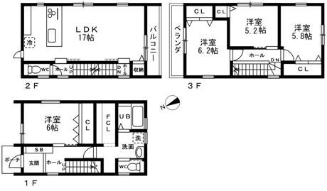 4LDK 1F/洋室 6.0帖 1室 2F/LDK 17.0帖 1室 3F/洋室 6.2帖 1室 3F/洋室 5.8帖 1室 3F/洋室 5.2帖 1室 |