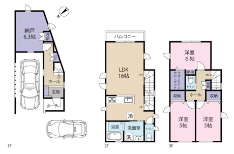 3LDK+1S(納戸) 1F/S 6.3帖 1室 2F/LDK 16.0帖 1室 3F/洋室 6.0帖 1室 3F/洋室 5.0帖 2室 |