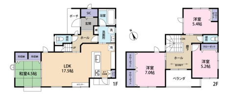 4LDK 1F/LDK 17.5帖 1室 1F/和室 4.5帖 1室 2F/洋室 7.0帖 1室 2F/洋室 5.4帖 1室 2F/洋室 5.2帖 1室 |
