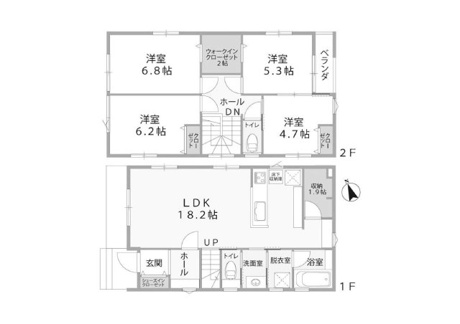 4LDK 1F/LDK 18.2帖 1室 2F/洋室 6.8帖 1室 2F/洋室 6.2帖 1室 2F/洋室 5.3帖 1室 2F/洋室 4.7帖 1室 |