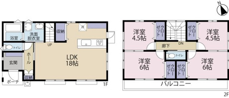 4LDK 1F/LDK 18.0帖 1室 2F/洋室 6.0帖 2室 2F/洋室 4.5帖 2室 |