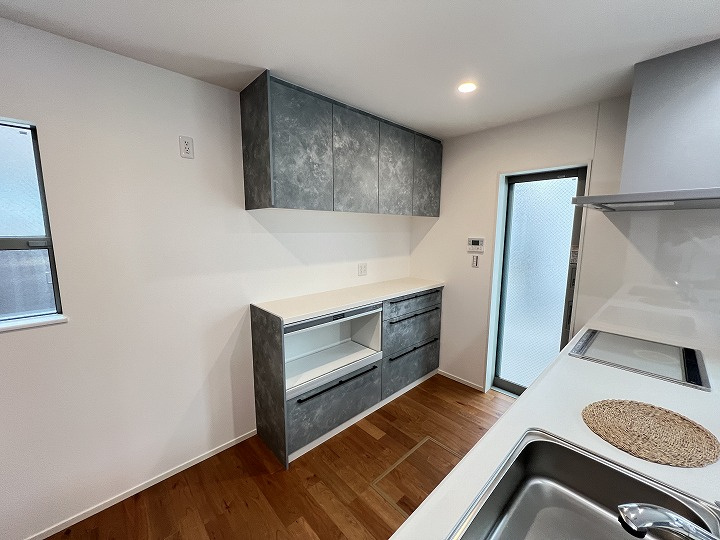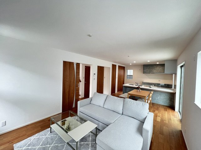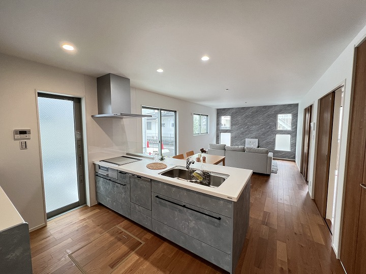 屋上はルーフバルコニーとなっており、空を見上げながら天体観測や読書など、特別な時間をお楽しみいただけます。駐車場は2台分確保。おしゃれで開放感のあるオープンキッチンに、ゆとりのある洗面脱衣所を備えています。4LDK、南向きで陽当たり良好な物件です。