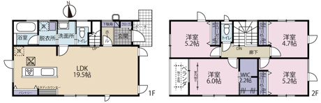 4LDK 1F/LDK 19.5帖 1室 2F/洋室 6.0帖 1室 2F/洋室 5.2帖 2室 2F/洋室 4.7帖 1室 |