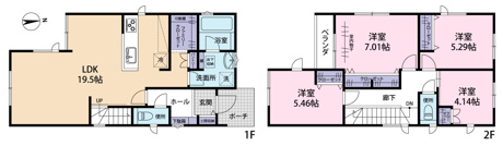 4LDK 1F/LDK 19.5帖 1室 2F/洋室 7.0帖 1室 2F/洋室 5.4帖 1室 2F/洋室 5.2帖 1室 2F/洋室 4.1帖 1室 |