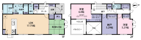 3LDK+1S(納戸) 1F/LDK 17.7帖 1室 1F/和室 4.5帖 1室 2F/洋室 6.0帖 1室 2F/洋室 5.2帖 1室 2F/S 5.2帖 1室 |